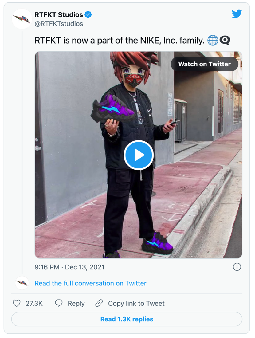 <blockquote class="twitter-tweet"><p lang="en" dir="ltr">RTFKT is now a part of the NIKE, Inc. family. 🌐👁🗨 <a href="https://t.co/5egNk9d8wA">pic.twitter.com/5egNk9d8wA</a></p>— RTFKT Studios (@RTFKTstudios) <a href="https://twitter.com/RTFKTstudios/status/1470502799498792963?ref_src=twsrc%5Etfw">December 13, 2021</a></blockquote> <script async src="https://platform.twitter.com/widgets.js" charset="utf-8"></script>