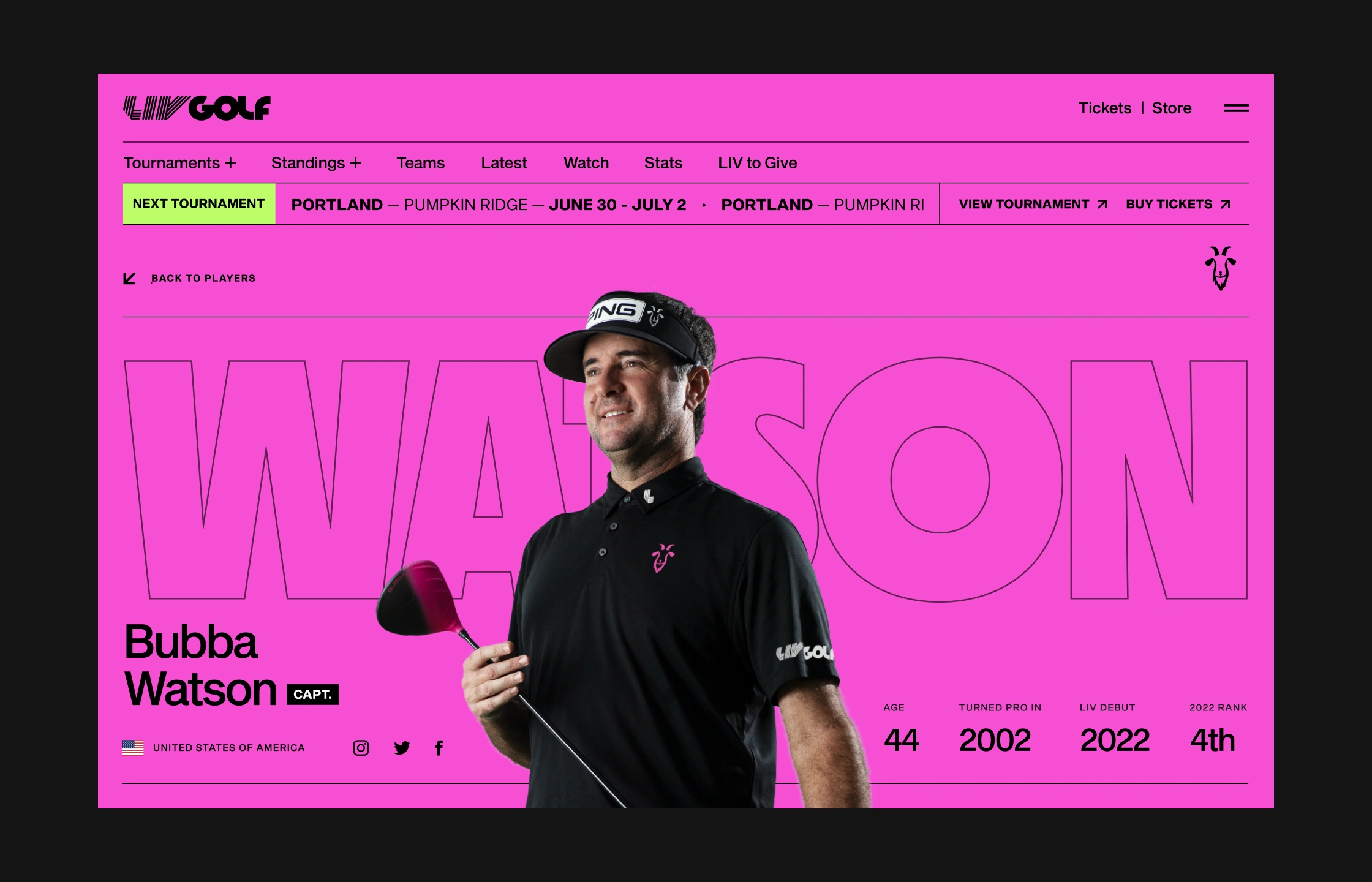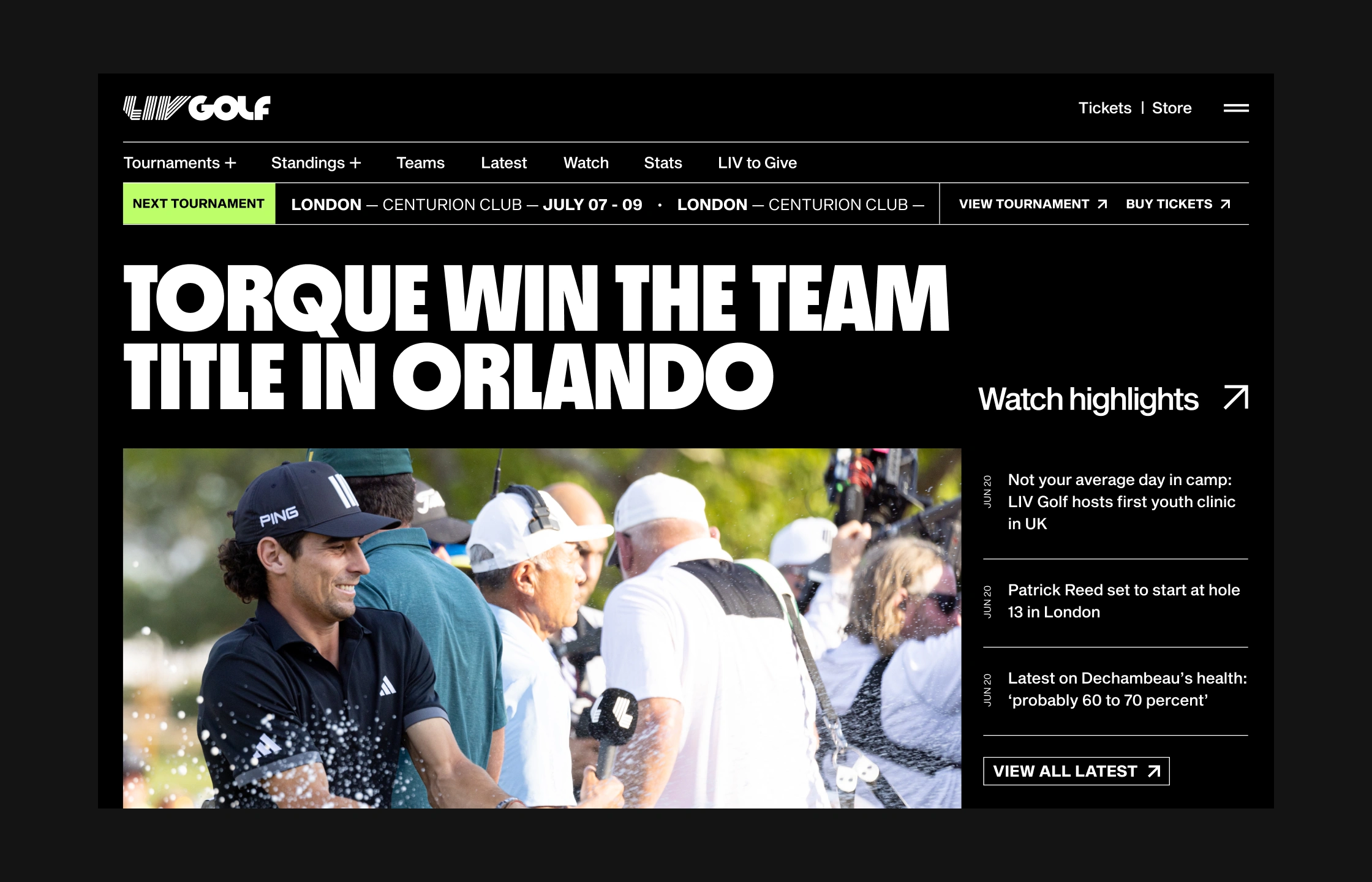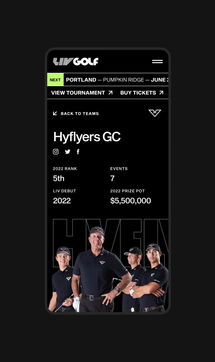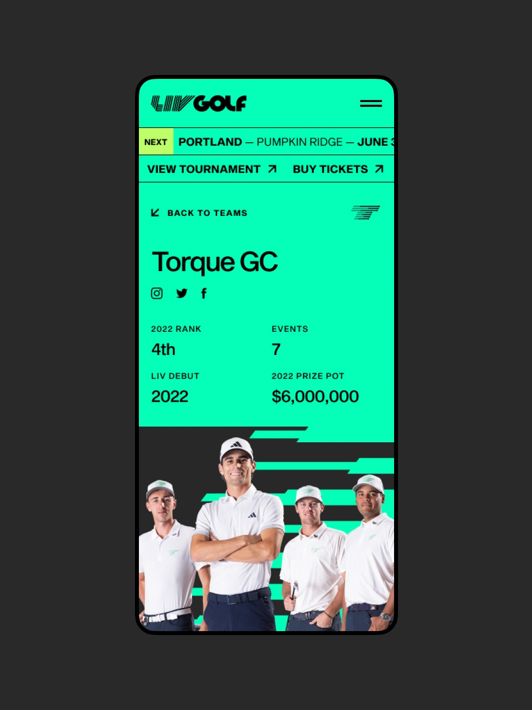 With 12 unique player-teams to accommodate, each with its own franchise brand, we’ve built independent sites to house them within the technical solution. This enables all of the teams to establish their own digital presence, connecting and growing their owned fanbases with the support of the wider LIV Golf digital ecosystem.