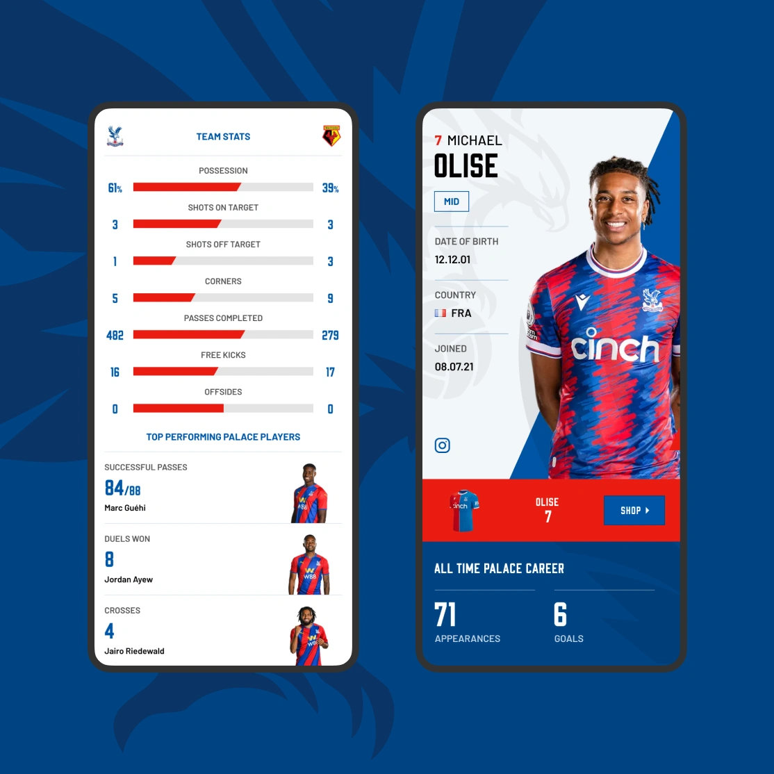 - Match and player centres, in-stadium experience