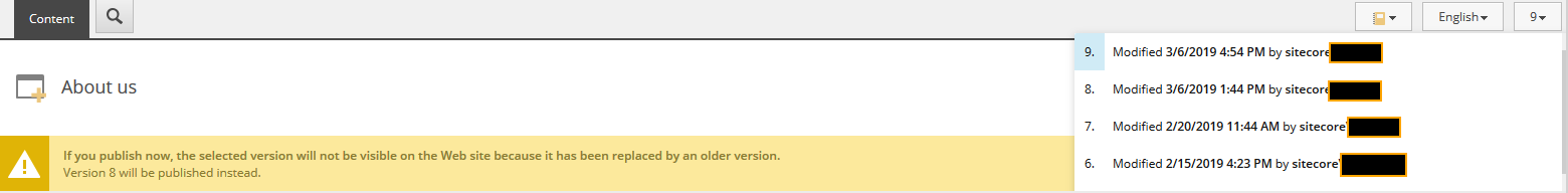In this case, you can see on the right hand side “9”, this is the number of versions of the “About us” item. The content editor is free to look at earlier versions.