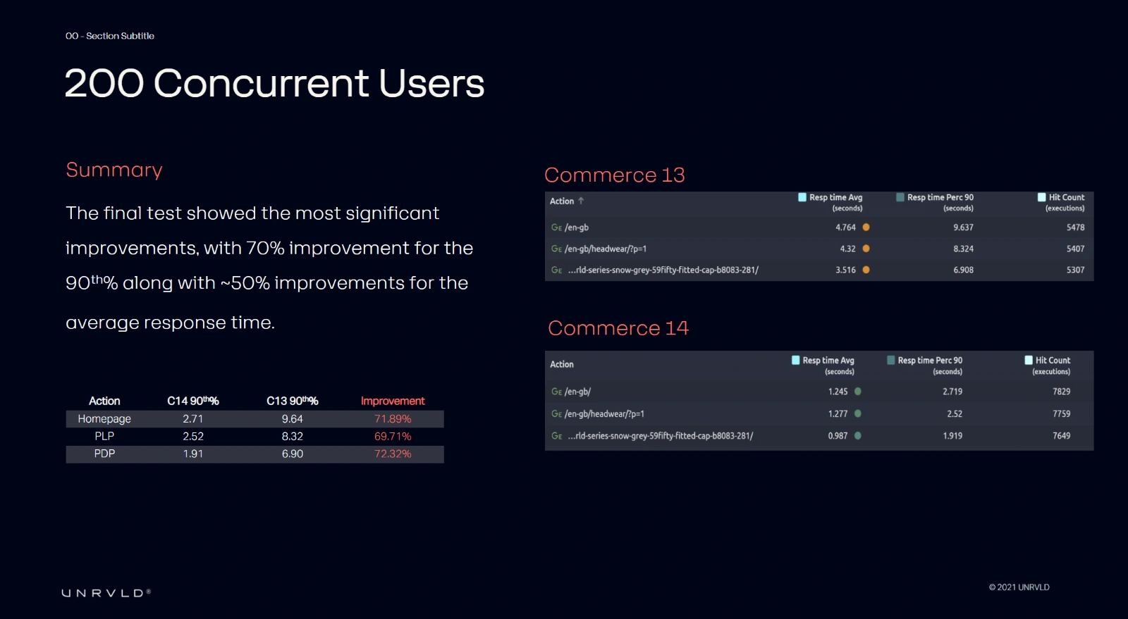 But whilst the site speed benefits were impactful, our research threw up even more interesting data. As we increased the volume of concurrent users to 100, then 200 concurrent users, still on comparable hardware, we noted performance improvements in the region of 70%!