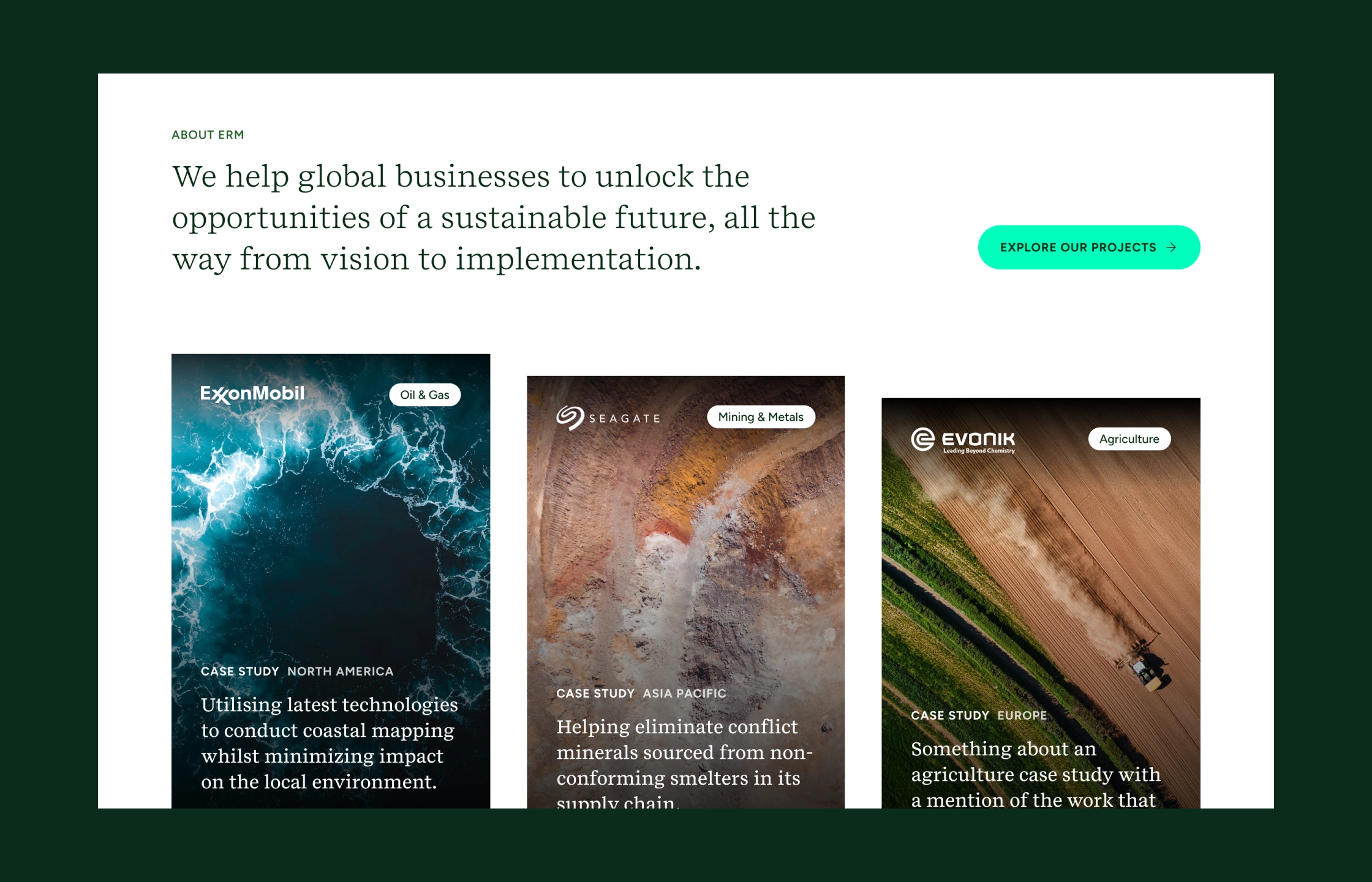 Collaborating closely with ERM’s branding agency, we've delivered a significant design update to align the website with their evolving brand identity, values and the changing market landscape. By transforming the digital experience we are asserting ERM’s position as an established leader within the sector.