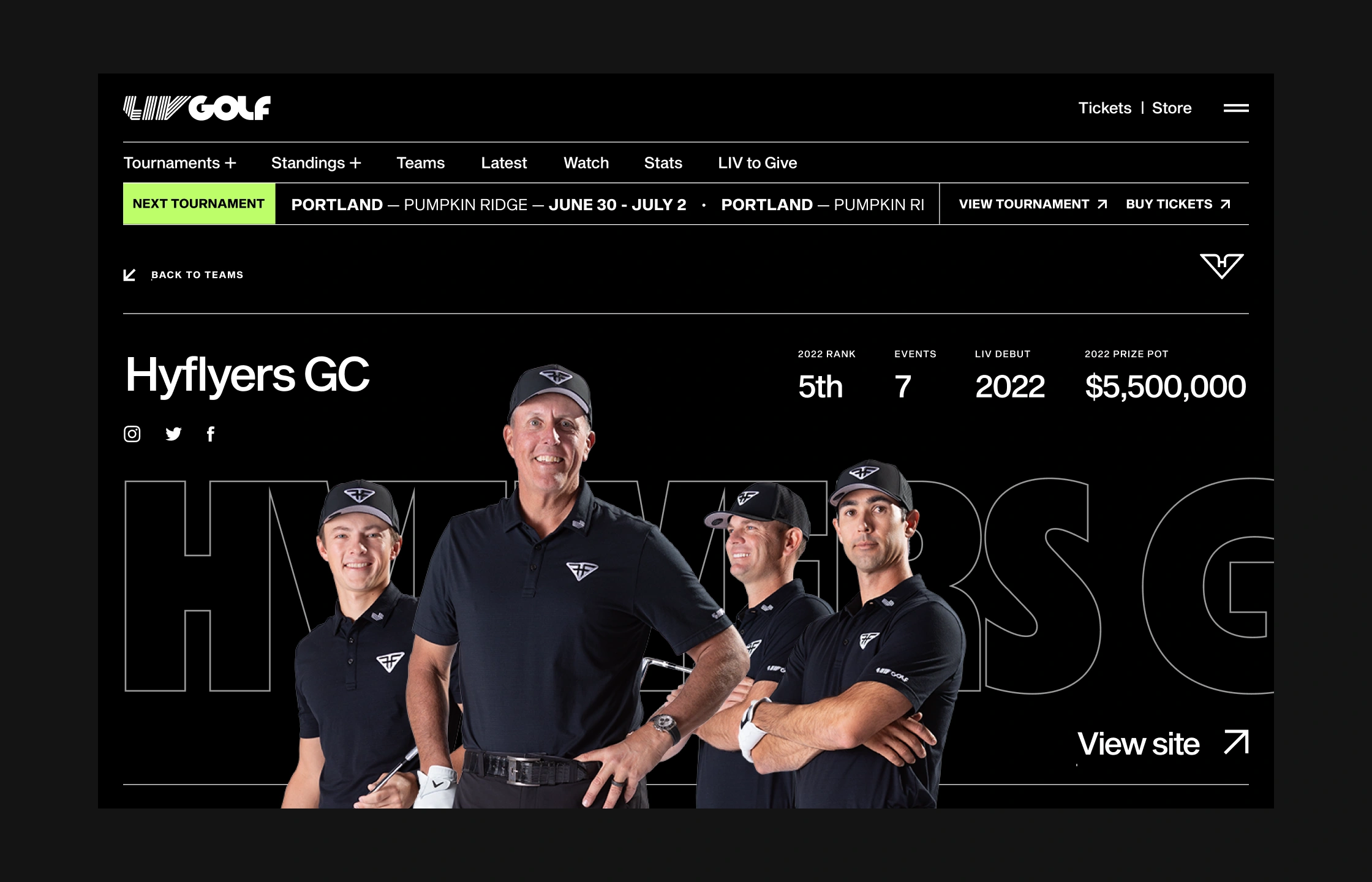 With 12 unique player-teams to accommodate, each with its own franchise brand, we’ve built independent sites to house them within the technical solution. This enables all of the teams to establish their own digital presence, connecting and growing their owned fanbases with the support of the wider LIV Golf digital ecosystem.